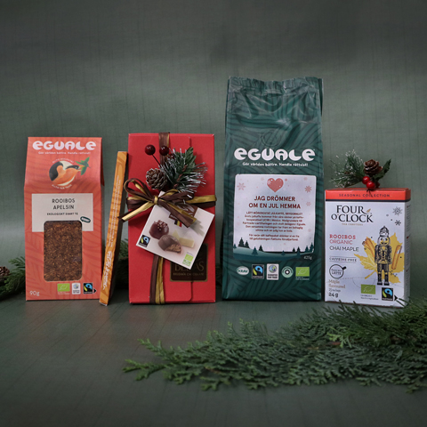 Julpaketet innehåller utvalda delar av vårt lyxiga sortiment med Fairtrade och ekologiska godsaker. Alla är Fairtrade och ekologiska. Njut av det goda.