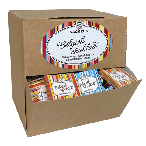 En blandning av kraftig mörk choklad och len belgisk mjölkchoklad i perfekt storlek till en kopp kaffe. Varje låda innehåller 1kg; ca 2/3 mörk choklad och ca 1/3 ljus choklad, totalt ca 200 bitar à ca 5g.